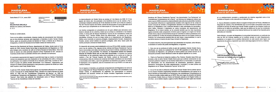 En la misiva, el Gobernador recordó que Giraldo creó las Autodefensas Campesinas del Magdalena y Guajira y en 2002 el ‘Frente Resistencia Tayrona’. Frente que más adelante fue rebautizado como el ‘Bloque Resistencia Tayrona de las Autodefensa Unidas de Colombia –Auc-. Asimismo, el mandatario le advierte al Ministro el posible regreso a la criminalidad de Giraldo en la Sierra Nevada de Santa Marta y otras zonas del Departamento.