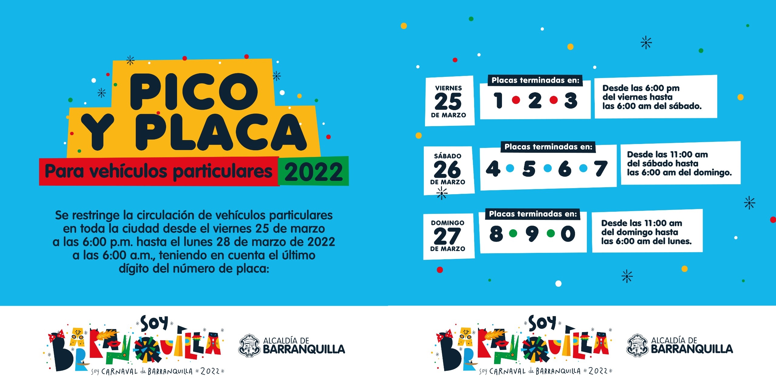 Mediante Decreto 0264 del 22 de marzo de 2022, se declaró días cívicos en Barranquilla los días 26, 27, 28 y 29 de marzo, con ocasión de la celebración del Carnaval de Barranquilla.