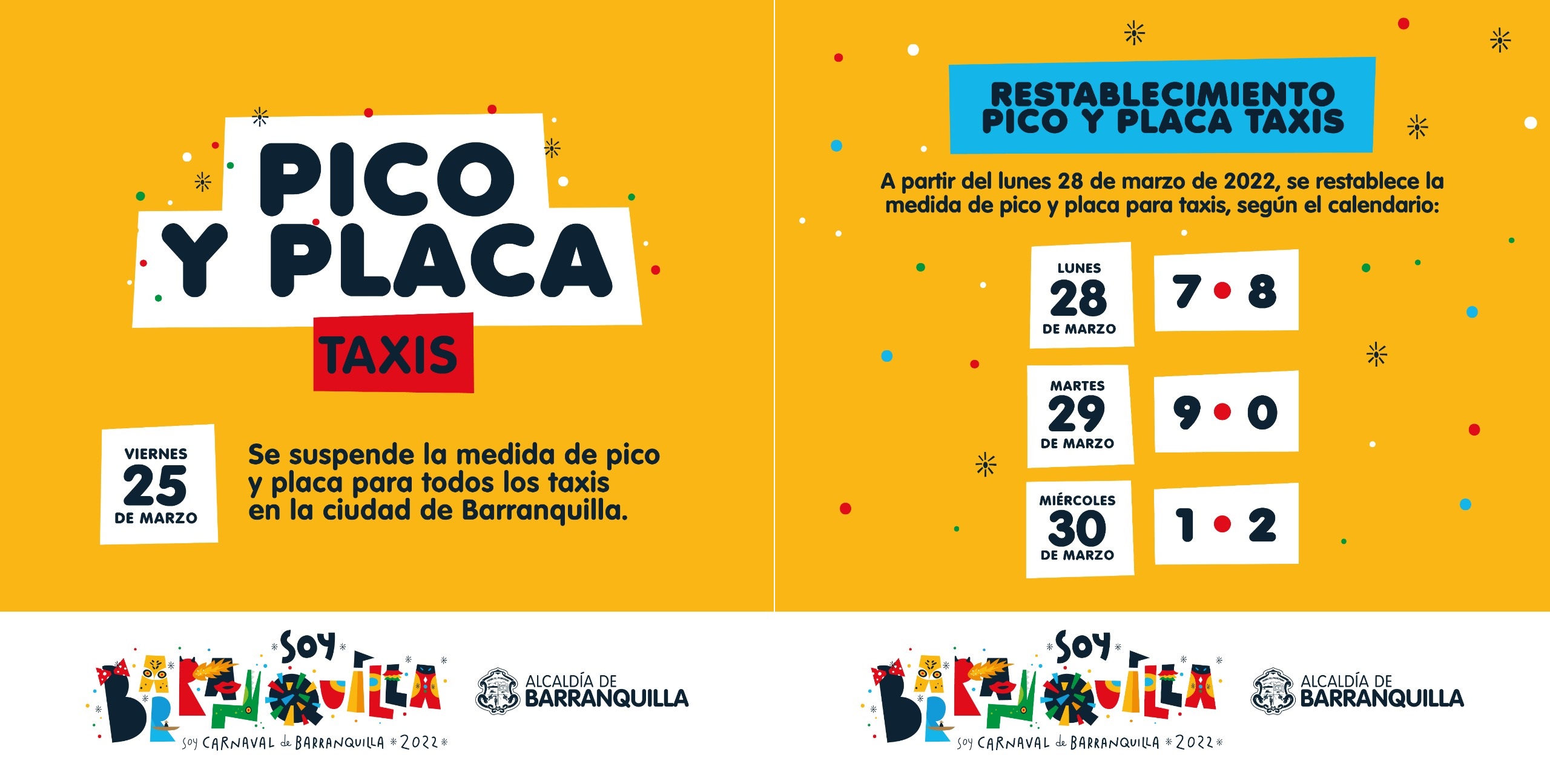 El viernes 25 de marzo de 2022 se suspende la medida de pico y placa para todos los taxis en la ciudad de Barranquilla.