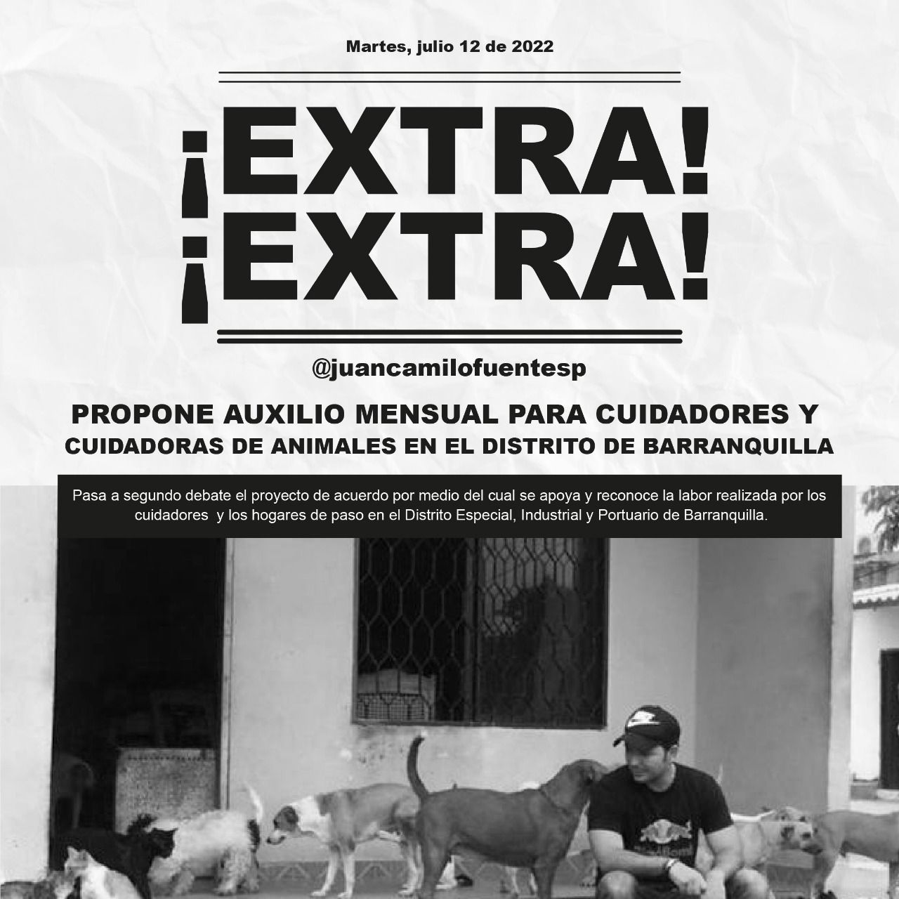 El Concejal presentó este acuerdo con el objetivo de generar una ayuda en especie a cuidadores que vienen realizando una gestión sin precedentes en el Distrito con recursos propios. “Debemos garantizar a los cuidadores, animalistas, rescatistas y cuidadores del Distrito un auxilio mensual en especie” Fuentes Pumarejo