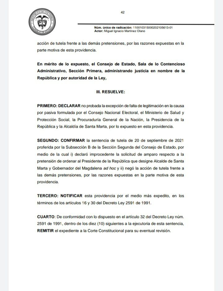 En ese sentido, el tribunal supremo de la jurisdicción de lo contencioso administrativo resolvió “confirmar la sentencia de tutela de 20 de septiembre de 2021 proferida por la Subsección B de la Sección Segunda del Consejo de Estado, por medio de la cual declaró improcedente la solicitud de amparo respecto a la pretensión de ordenar al Presidente de la República que designe Alcalde de Santa Marta y Gobernador del Magdalena ad hoc, negando la acción de tutela frente a las demás pretensiones”, por las razones expuestas en la parte motiva de dicha providencia.