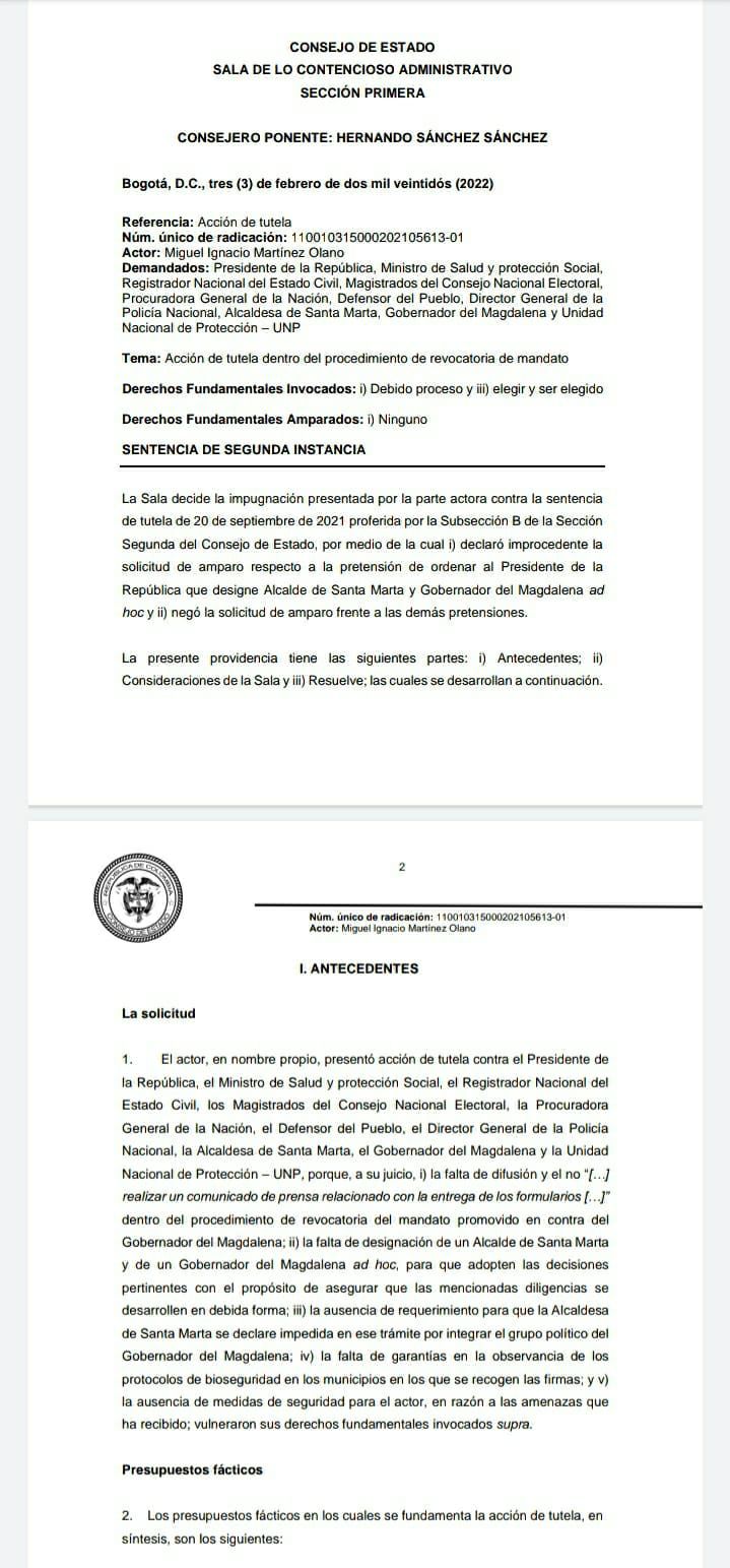 Así lo reafirmó la Sección Primera de la Sala de lo Contencioso Administrativo del Consejo de Estado, luego que el ponente de la tutela, identificado como Miguel ‘El Mono’ Martínez, alegó: la falta de difusión; la no realización de un comunicado de prensa relacionado con la entrega de los formularios de la revocatoria; la falta de designación de un Alcalde de Santa Marta y de un Gobernador del Magdalena ad hoc, para que adopten las decisiones pertinentes con el propósito de asegurar que las mencionadas diligencias se desarrollen en debida forma; entre otros argumentos que fueron reiterados como improcedentes por el Consejo de Estado.