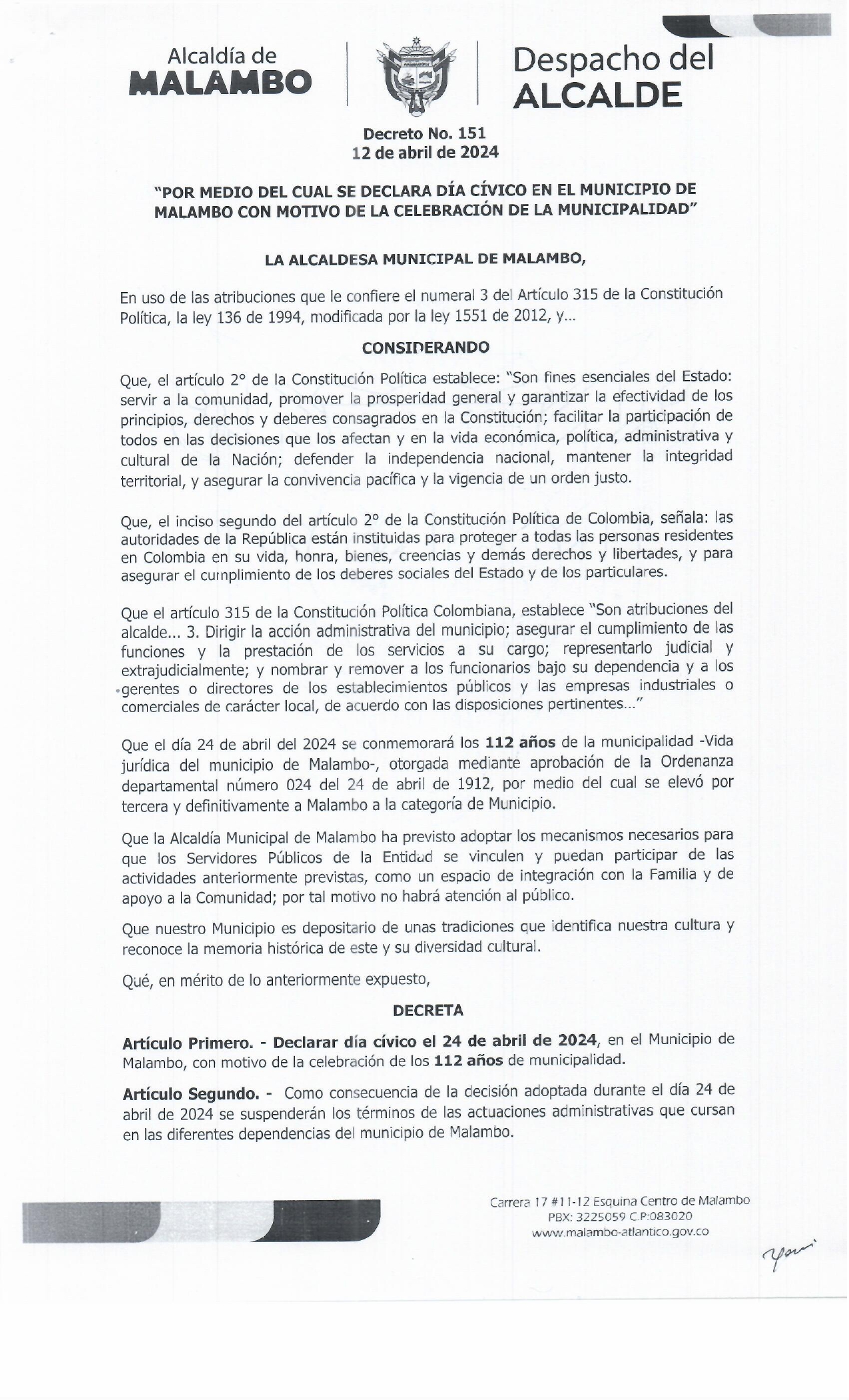 La alcaldesa, Yenis Orozco mediante decreto 151 del 12 de abril de 2024, declaró día cívico el miércoles 24 del presente mes.