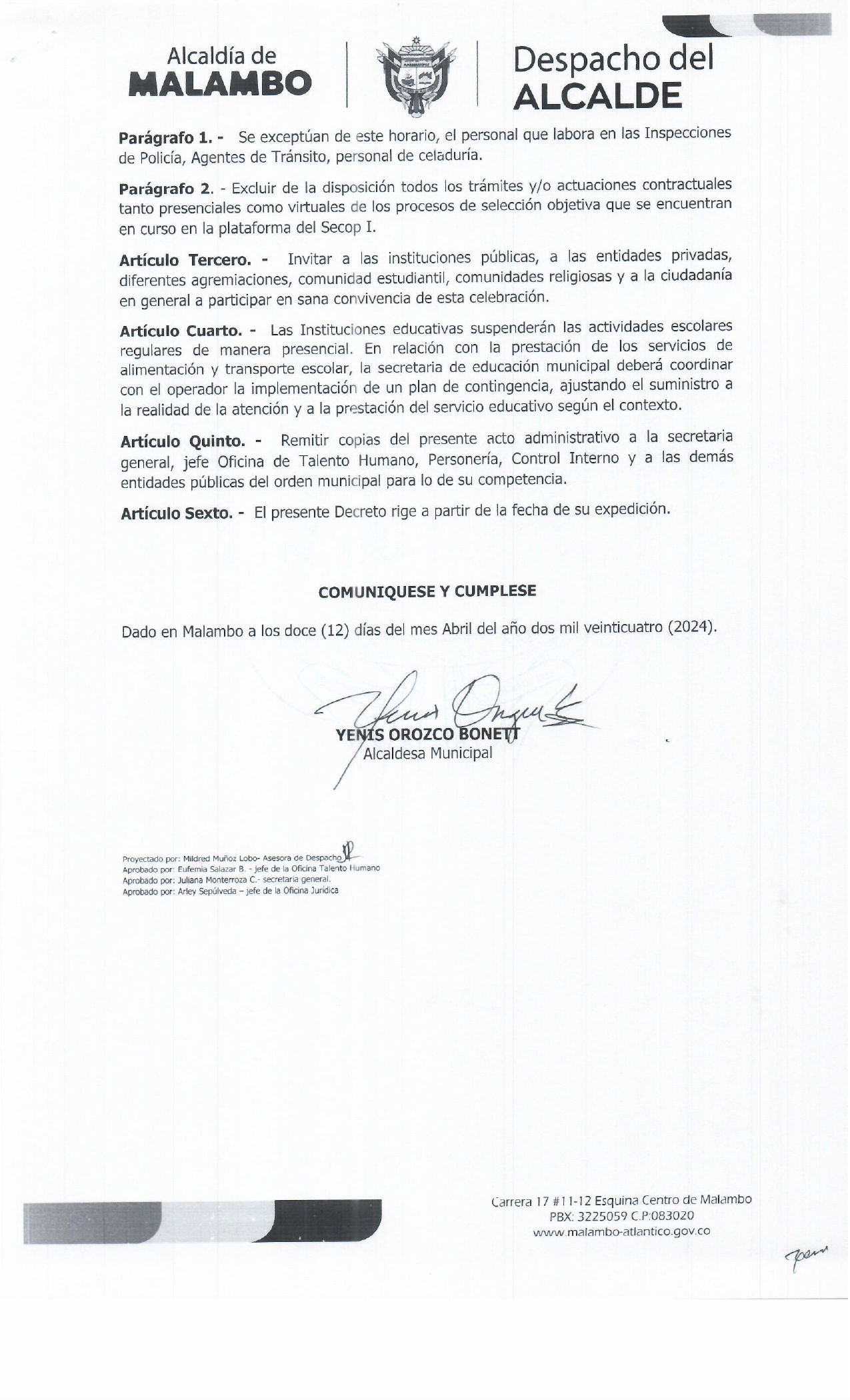 De igual forma, el decreto en mención establece durante este día, excepción para los procesos contractuales de selección objetiva que cursen en la plataforma Secop I, en el municipio de Malambo.