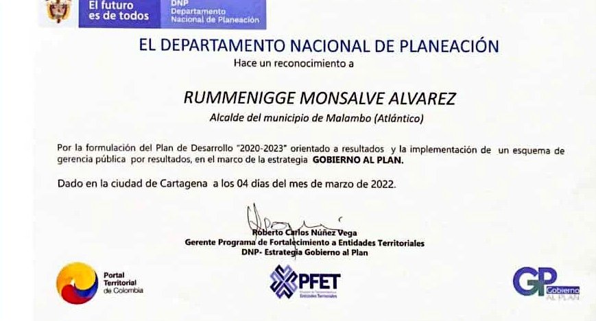 En el marco de un reconocimiento público hecho por el Departamento Nacional de Planeación (DNP) a los entes territoriales más destacados en materia de su Plan de Desarrollo, Malambo fue galardonado.