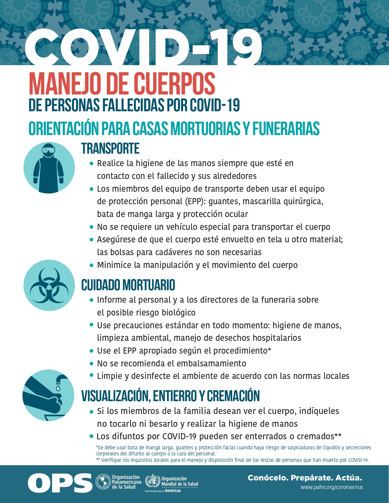 Esta recomendación no obliga a los familiares autorizar la cremación del cuerpo y deja la posibilidad de inhumar. Sin embargo, el cuerpo debe ser cremado o sepultado en el menor tiempo posible para evitar contagios en el personal de las funerarias y la comunidad. Los rituales religiosos como velorios y las nueve noches sí están prohibidos. “El transporte, la cremación o inhumación, según sea el caso, se efectuará en el menor tiempo posible, con el fin de prevenir la exposición de los trabajadores y comunidad general al virus SARS-COV-2 (COVID-19). Se debe evitar la realización de rituales fúnebres que conlleven reuniones o aglomeraciones de personas.”