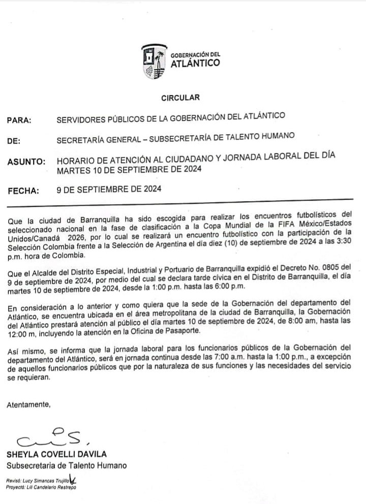 Mediante circular emitida por la Subsecretaría de Talento Humano de la Gobernación del Atlántico se dio a conocer que la administración departamental “prestará atención al público el día martes 10 de septiembre de 2024, desde las 8:00 a. m. hasta las 12 m, incluyendo la Oficina de Pasaporte”.