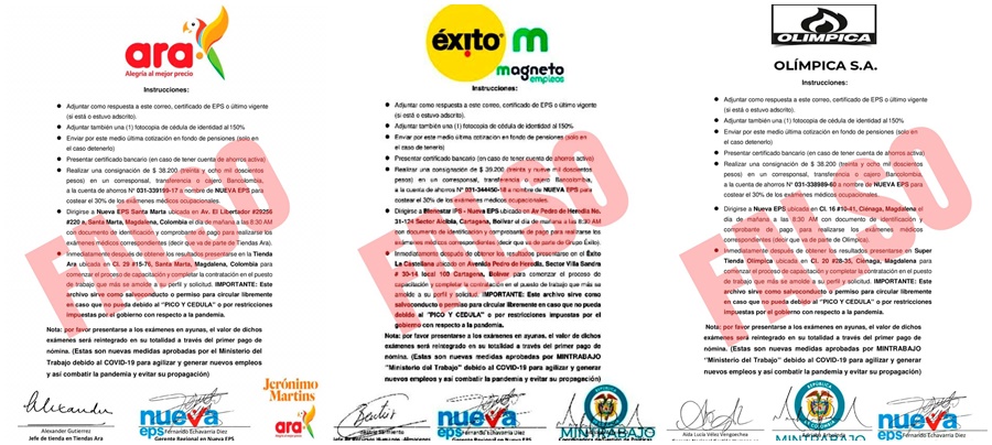 Dentro de las modalidades de estafa han sido identificadas comunicaciones -adjunto- en las que solicitan consignaciones a una supuesta cuenta de ahorros de NUEVA EPS para costear el 30% del valor de exámenes médicos de ingreso laboral en diferentes tiendas de abarrotes del país donde solicitan una serie de documentos a vuelta de correo con el fin de generar una falsa sensación de formalidad y así cautivar a más personas.