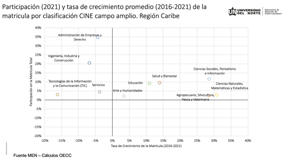 Destaca el mismo informe que la formación en educación ha crecido en las instituciones de educación superior del Caribe colombiano: “áreas como la Educación no tienen tanto peso en la matrícula, pero su crecimiento en los últimos años ha sido positivo. Esto indicaría que cada vez se forman más maestros, pero se para un mercado controlado, donde el oferente es el Estado y los tiempos de ingreso son amplios”, puntualiza el coordinador.