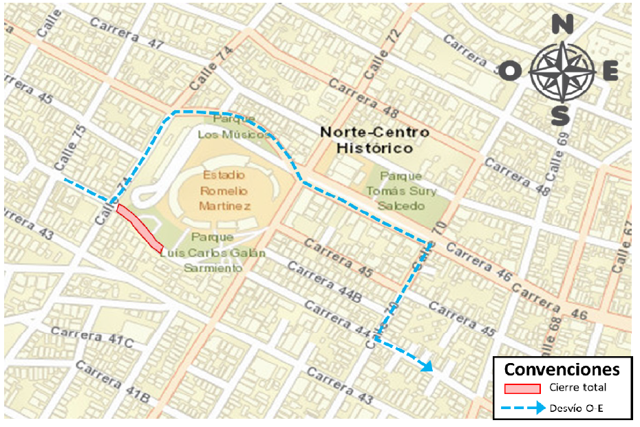 Los vehículos que transitan en sentido occidente – oriente por la carrera 44 deben girar a la izquierda en la calle 74 y luego a la derecha en la carrera 46, para luego girar a la derecha en la calle 70 hasta retomar en la carrera 44 a la izquierda.