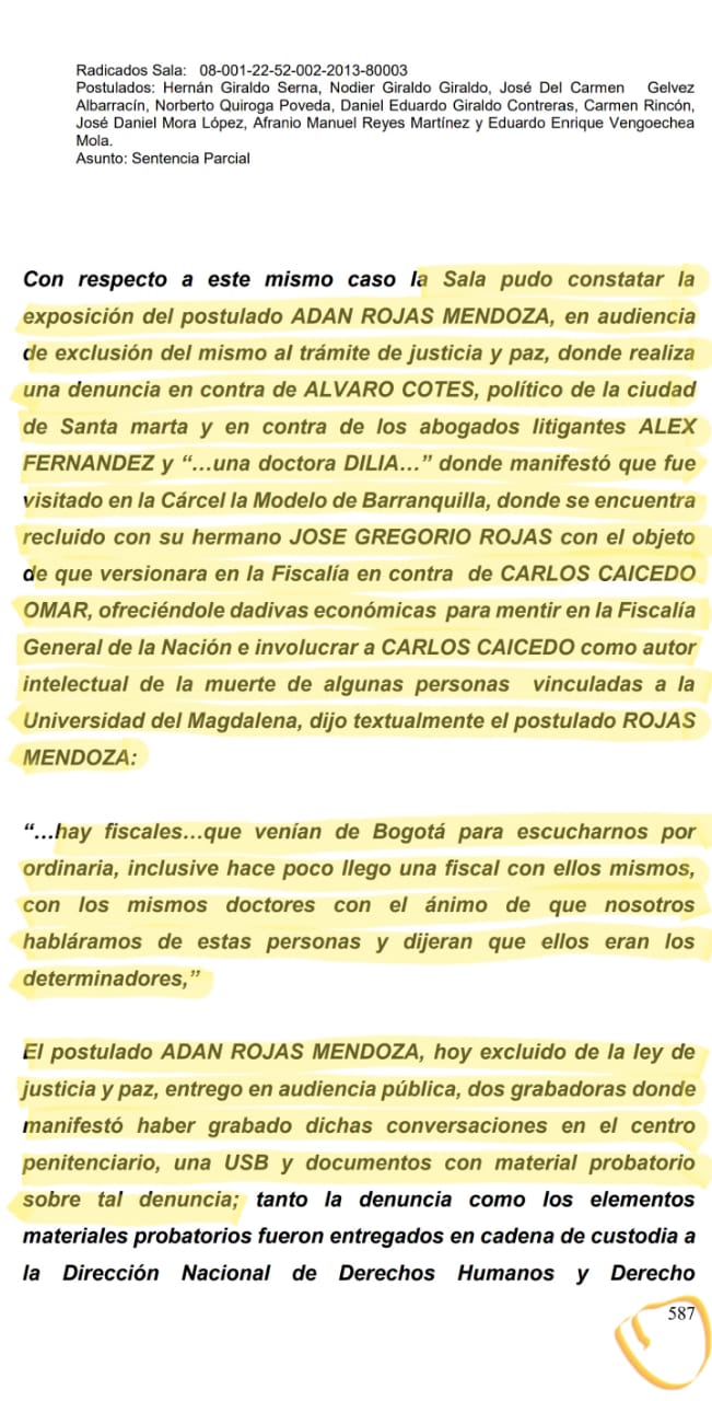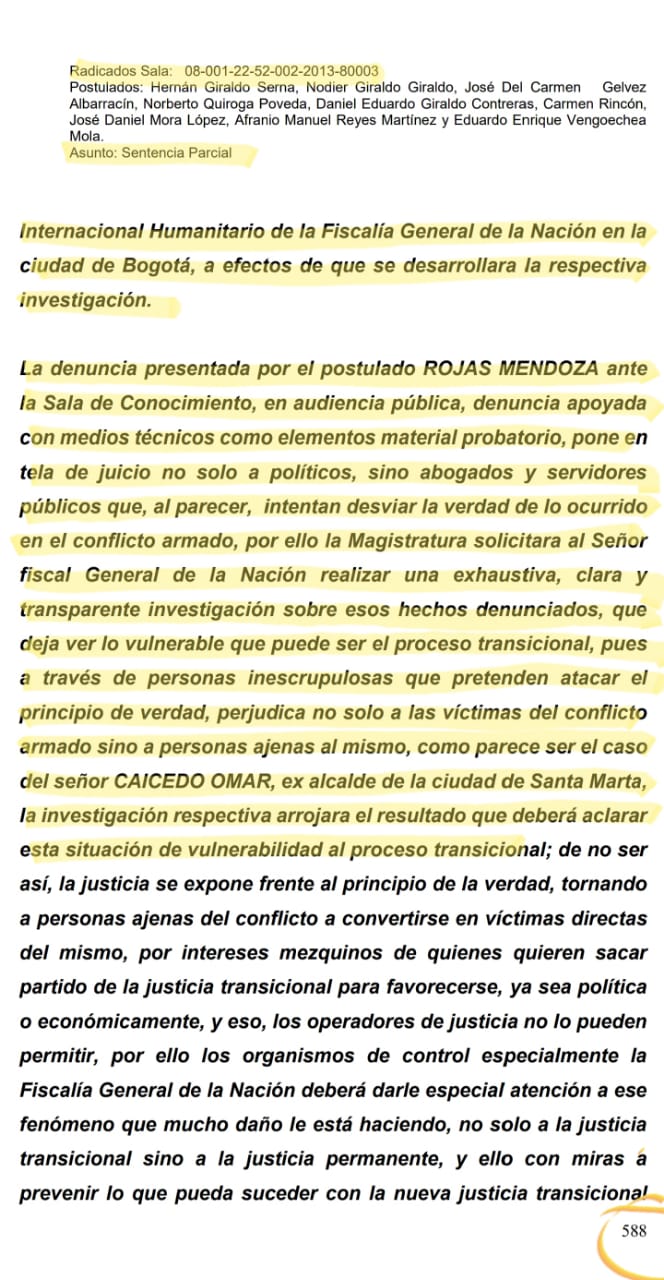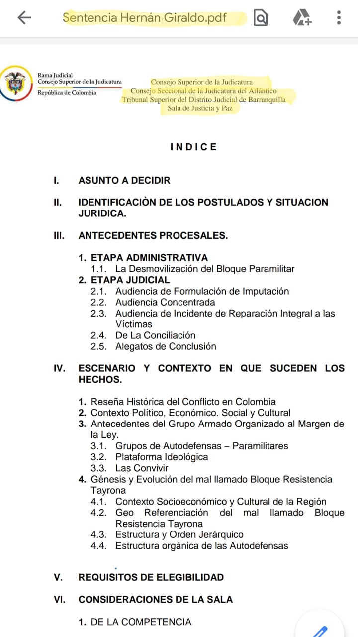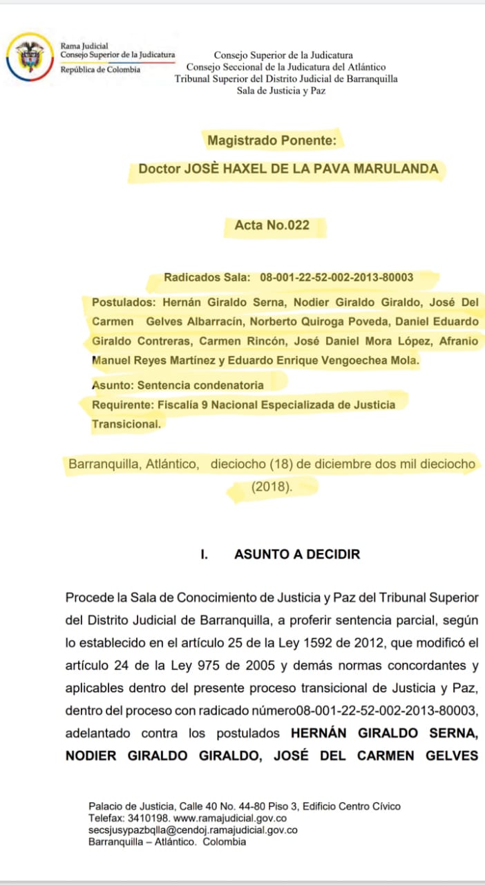 Hechos éstos que no solo quedaron consignados como denuncia en la diligencia pertinente de justicia y paz sino en la sentencia aprobada mediante Acta 022 en el proceso radicado 08-001-22-52-002-2013-80003 con la que se profirió sentencia condenatoria contra los postulados Hernán Giraldo Serna, Nodier Giraldo Giraldo, José Del Carmen Gelves Albarracín, Norberto Quiroga Poveda, Daniel Eduardo Giraldo Contreras, Carmen Rincón, José Daniel Mora López, Afranio Manuel Reyes Martínez y Eduardo Enrique Vengoechea Mola previa acusación de la fiscalía 9 nacional especializada de justicia transicional de fecha 18 de diciembre de 2018. Sentencia que hoy está en firme.