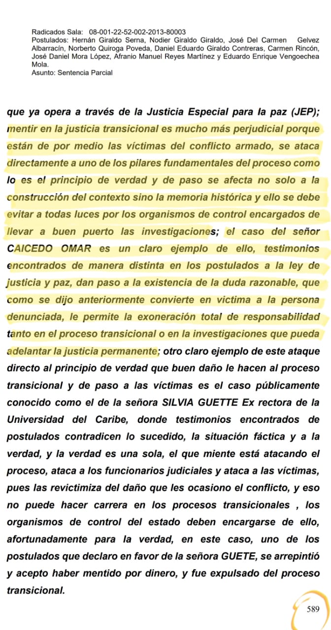 La Sala de Justicia y Paz del Tribunal Superior de Barranquilla concluyó, en cuanto a la situación de Carlos Caicedo, que «mentir en la justicia transicional es mucho más perjudicial porque están de por medio las víctimas del conflicto armado, se ataca directamente a uno de los pilares fundamentales del proceso como lo es el principio de verdad y de paso se afecta no solo a la construcción del contexto sino la memoria histórica y ello se debe evitar a todas luces por los organismos de control encargados de llevar a buen puerto las investigaciones; el caso del señor CAICEDO OMAR es un claro ejemplo de ello, testimonios encontrados de manera distinta en los postulados a la ley de justicia y paz, dan paso a la existencia de la duda razonable, que como se dijo anteriormente convierte en victima a la persona denunciada, le permite la exoneración total de responsabilidad tanto en el proceso transicional o en la investigaciones que pueda adelantar la justicia permanente; (…)«.