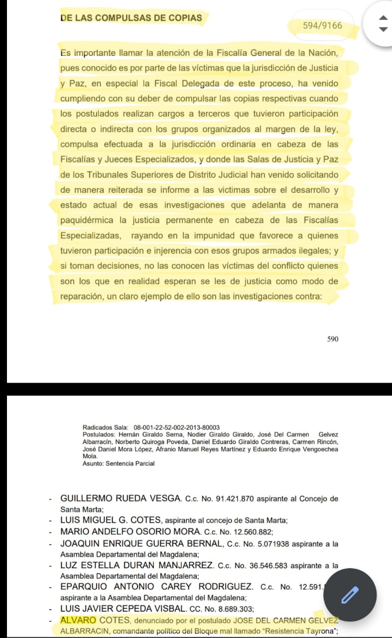 No así la situación del narcotraficante Álvaro Cotes Vives quien por orden la sentencia proferida por la sala de justicia y paz debe ser investigado por la justicia ordinaria conforme quedó consignado en dicho fallo.