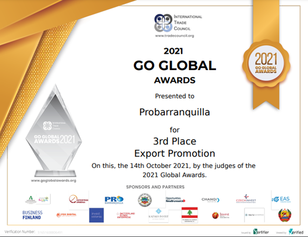 ProBarranquilla recibió el galardón por el tercer puesto la labor de promoción de exportaciones el pasado 14 de octubre durante la ceremonia virtual de los Go Global Awards 2021.